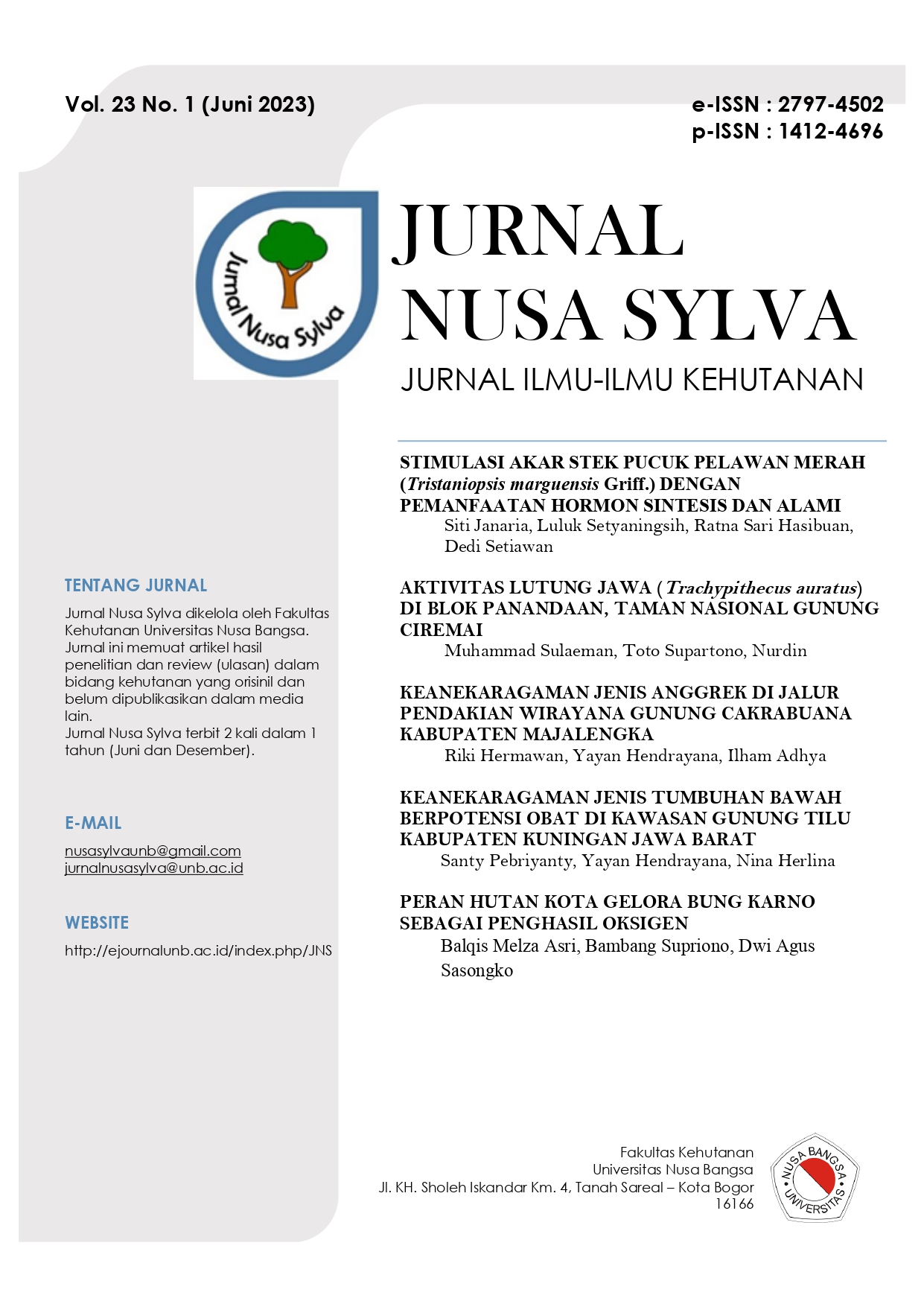 Janaria, S., Setyaningsih, L., Hasibuan, R. S., & Setiawan, D. (2023). STIMULASI AKAR STEK PUCUK PELAWAN MERAH (Tristaniopsis marguensis Griff.) DENGAN PEMANFAATAN HORMON SINTESIS DAN ALAMI. Jurnal Nusa Sylva, 23(1), 1–9. https://doi.org/10.31938/jns.v23i1.478
